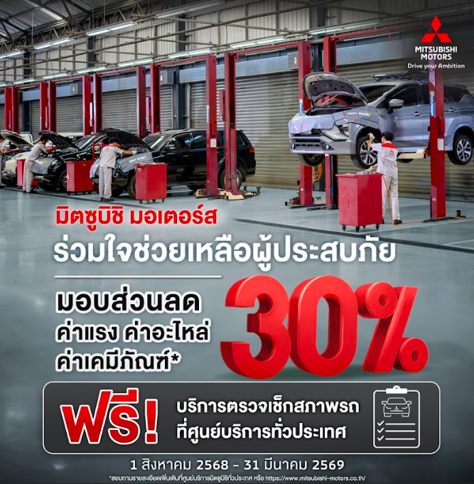 นอกจากนี้ มิตซูบิชิ มอเตอร์ส ประเทศไทย ยังมอบความคุ้มค่าและ ความสบายใจในการซ่อมบำรุงรถของลูกค้าหลังผ่านพ้นช่วงเวลาวิกฤติ ด้วยการเข้าร่วมกับภาคีเครือข่ายกว่า 21 แบรนด์ ทั้งผู้ผลิตรถยนต์ –รถจักรยานยนต์ ช่างผู้ชำนาญการจากส่วนกลางและภูมิภาค รวมถึงสถาบันอาชีวศึกษา ของศูนย์ประสานงาน “คมนาคมร่วมใจ ช่วยรถน้ำท่วม” กรมการขนส่งทางบก กระทรวงคมนาคม มอบส่วนลดทันที 30% สำหรับค่าอะไหล่ ค่าแรง และค่าเคมีภัณฑ์ (ไม่รวมแบตเตอรี่ ยางรถยนต์ และอุปกรณ์ตกแต่ง) พร้อมบริการตรวจเช็กสภาพรถฟรี กว่า 23 รายการ ครอบคลุมการตรวจช่วงล่าง ใต้ท้องรถ และการประเมินความเสียหาย ด้วยเครื่องสแกน MUT-III สำหรับรถยนต์มิตซูบิชิทุกรุ่น โดยสามารถ เข้ารับบริการได้ที่ศูนย์บริการมิตซูบิชิ มอเตอร์ส ทั่วประเทศ ตั้งแต่วันนี้ ถึง 31 มีนาคม 2569